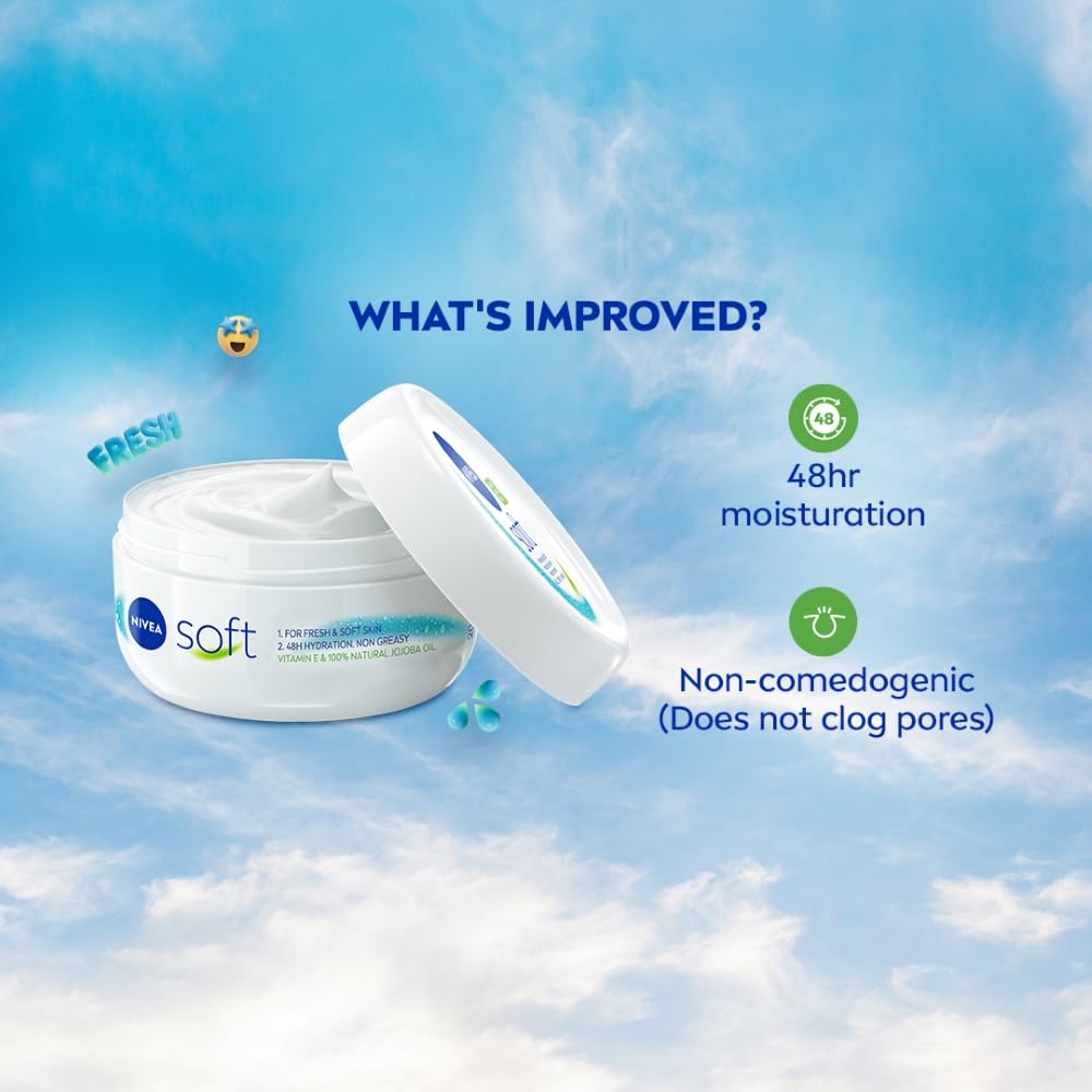 Enjoy intensive hydration in a light, non-greasy formula with NIVEA Soft Light Moisturizer, now in a value-sized 300ml pack. Enriched with Vitamin E and Jojoba Oil, this multi-purpose cream provides instant freshness and nourishment for your face, hands, and body. Perfect for daily use by the entire family, it absorbs quickly and leaves your skin feeling smooth, supple, and revitalized without any sticky residue.