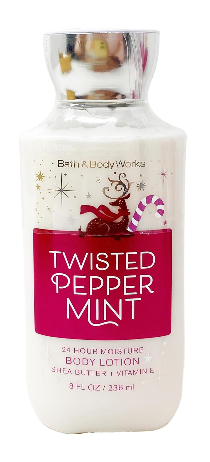 "Bath & Body Works Twisted Peppermint Body Lotion is a holiday favorite that brings a festive touch to your skincare routine. Infused with the invigorating scent of peppermint, vanilla, and sugary musk, this lotion delights your senses and leaves a refreshing fragrance on your skin. The nourishing formula, enriched with shea butter and vitamin E, deeply moisturizes and hydrates your skin, keeping it soft, smooth, and rejuvenated. Embrace the holiday spirit with Twisted Peppermint Body Lotion for beautifully scented and festive skin."