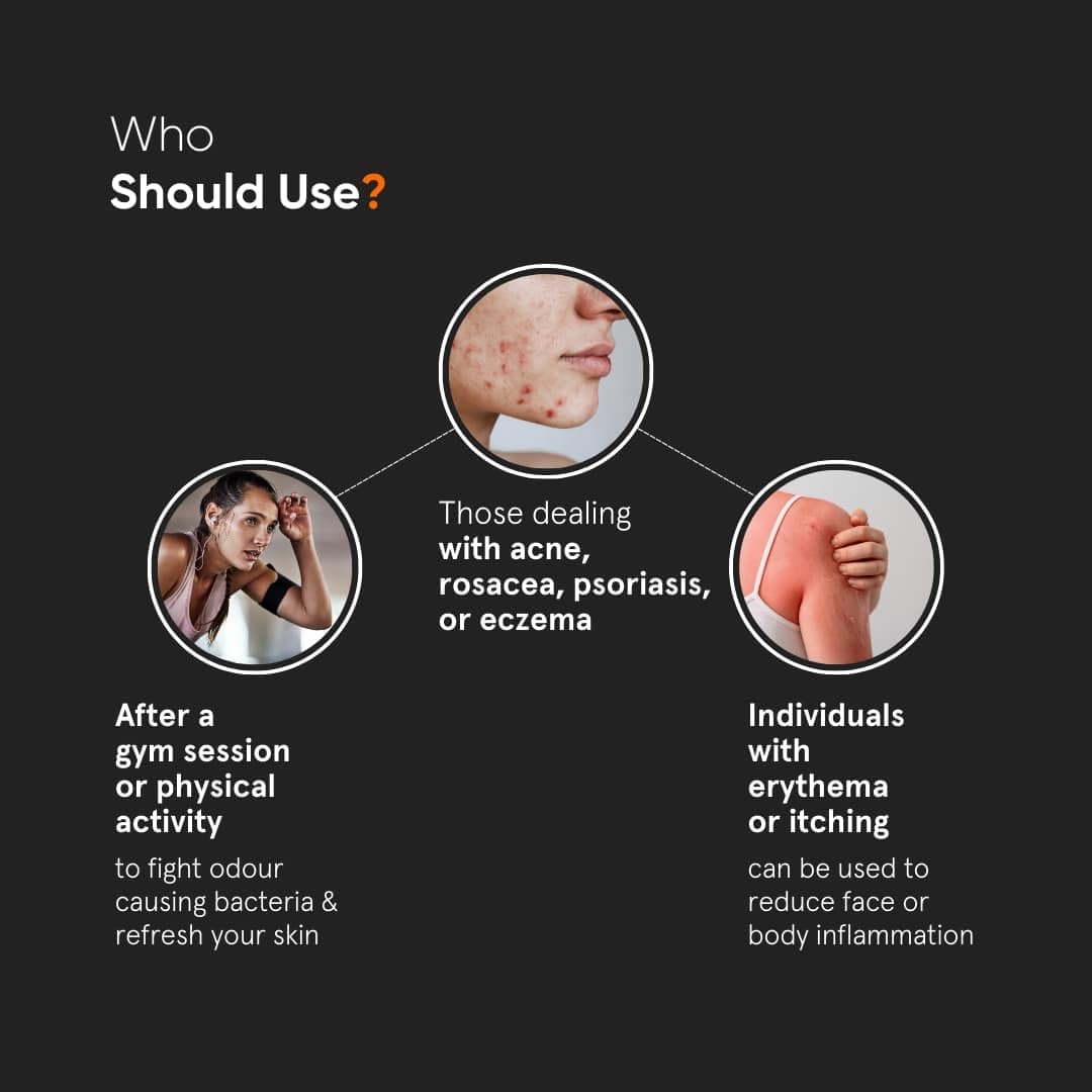 Spray directly onto clean, dry skin after workouts or sweating. Let air dry. No need to rinse. Use anytime for a soothing, skin-clearing refresh.