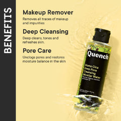 Get clear, smooth and fresher-looking complexion with Quench Mama Cica Deep Pore Cleansing Micellar Water. A super refreshing daily cleansing formula, it gently removes makeup, dirt, grime and excess oil from your skin and leaves it comfortably hydrated and supple. This water-based, non-oily makeup remover is a perfect daily-use essential for clear, supple skin free from daily grime and impurities. Mama Cica Deep Pore Cleansing Micellar Water has a non-irritating and skin calming formula, packed with natural ingredients like tea tree leaf and calendula extracts that deep cleanse and unclog pores without stripping away the skin's natural moisture. Enriched with the perfect blend of cica, Korean ginseng, lotus root extracts along with bergamot fruit oil, this daily cleansing micellar water reveals soft, refreshed and glowing skin in just a few swipes.