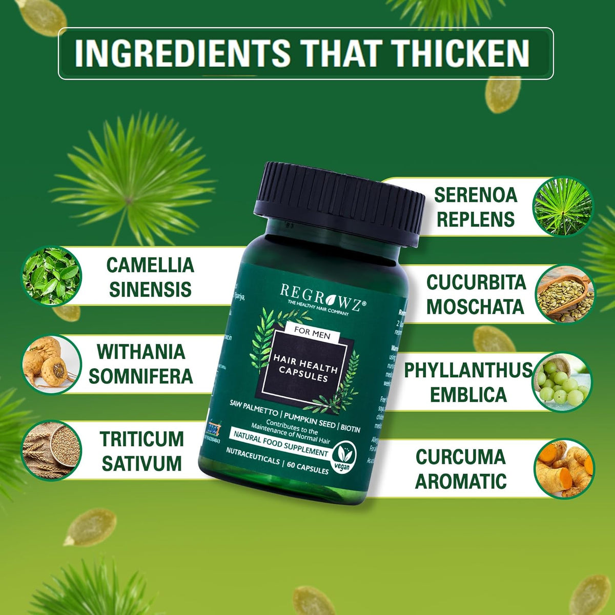 Support stronger, healthier-looking hair with Regrowz Hair Capsules for Men, a targeted nutritional hair supplement designed to meet the unique hair care needs of men. Powered by Biotin, Pumpkin Seed Extract, and carefully selected herbal extracts, these capsules help nourish hair from within for a well-groomed, fuller appearance.