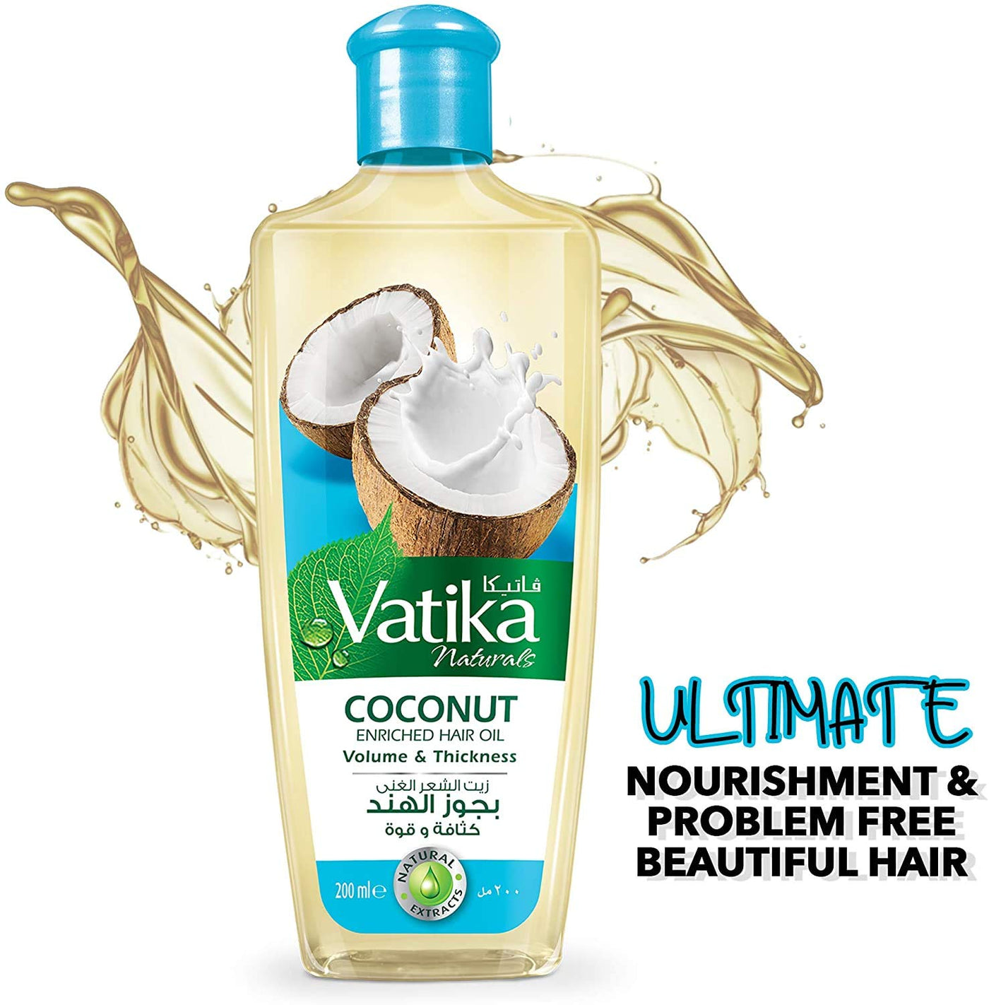 The new improved formulation of Vatika Enriched Coconut Hair Oil is proven to be better than ordinary coconut oil in 4 ways: It makes hair Stronger Hair become Thicker It makes hair Shinier Better Dandruff Control