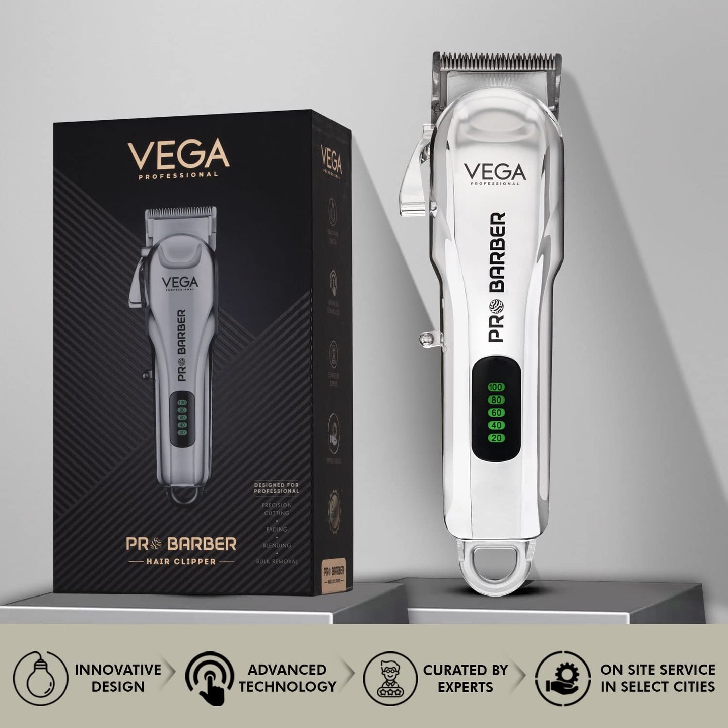 Presenting VEGA Professional Pro Barber that lets experienced hands explore their creative potential. It comes with a heavy duty cord/cordless and a light weight and ergonomic hair clipper for unrestricted movement. The powerful and quiet 6000 RPM supercharged rotary motor allows you to cut through both wet and dry hair with ease and speed. VEGA Professional Pro Barber comes with the innovative Japanese Stainless Steel deep tooth tapering, softline blending, texturizing, fading and bulk removal with utmost precision. The high performance 2000 MAH Lithium-Ion Battery gets fully charged in 180 mins and delivers an incredible 180 mins run time.